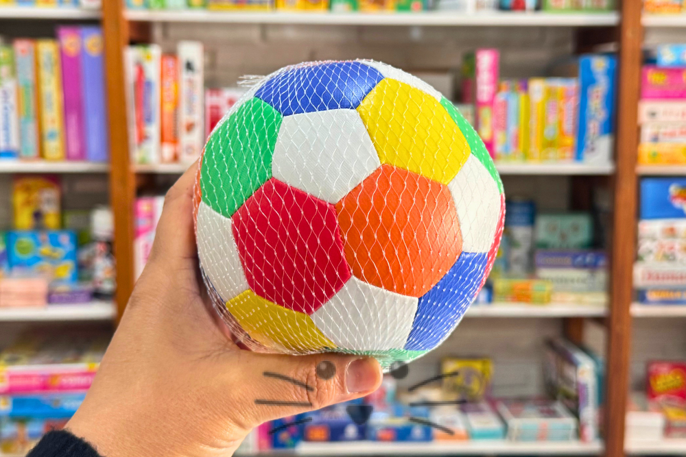 Pelota soft de goma espuma forrada en tela simil cuero de colores. Diámetro: 15 cm. Viene en bolsa de red. Edad Sugerida: a partir de 1 año en adelante.