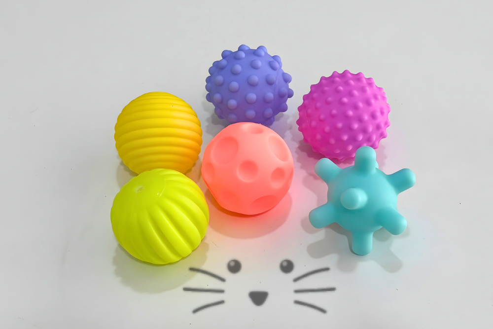 Material: Silicona suave y resistente. Contiene: 6 pelotas de 6,5 cm cada una. Edad sugerida: a partir de 3 meses.