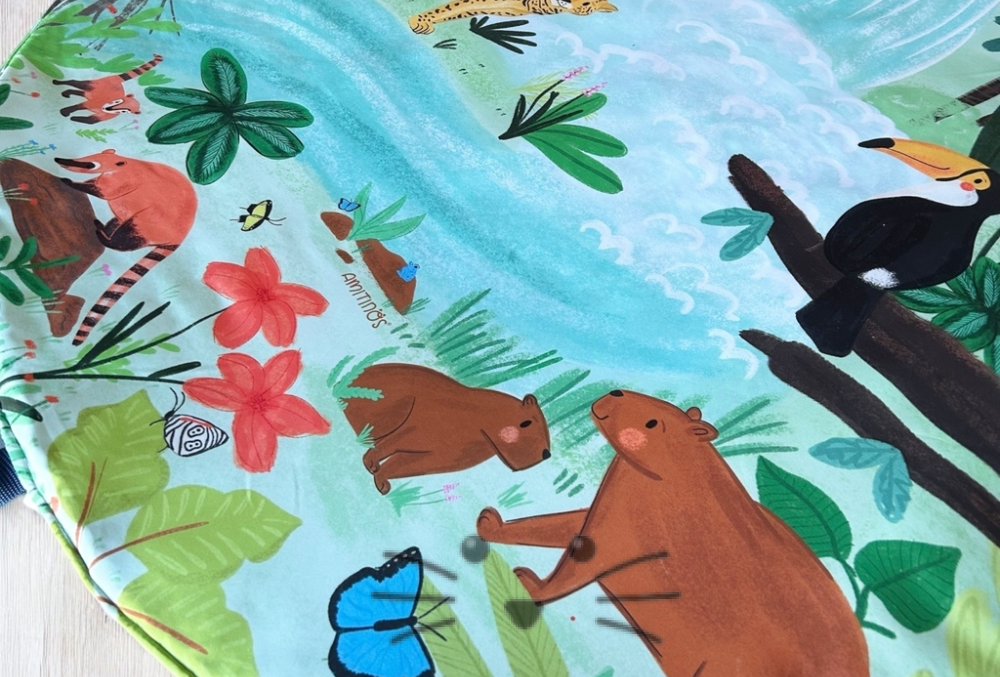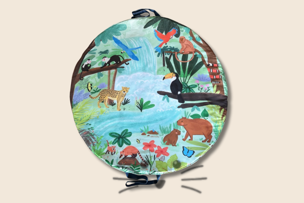 Manta para bebés que se hace bolso para trasladar los juguetes a donde quieras! Realizada en Microfibra sublimada, reverso en trucker impermeable súper resistente. Apta para interior y exterior, no pasa el frío. Rellena de guata 400 gramos que la hace muy acolchonada. Medida: 1,20 m de diámetro.