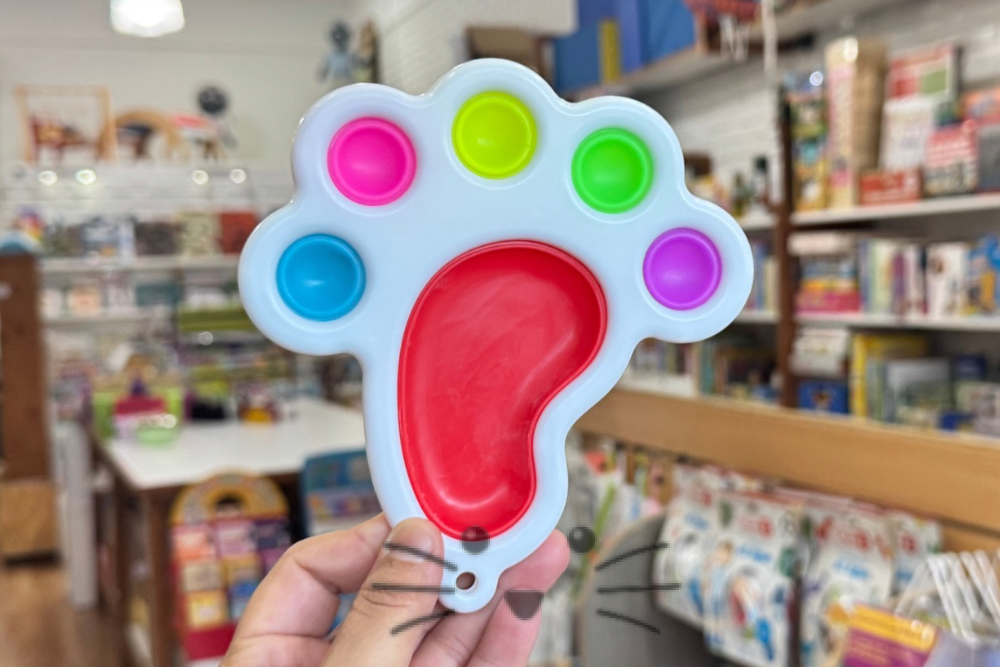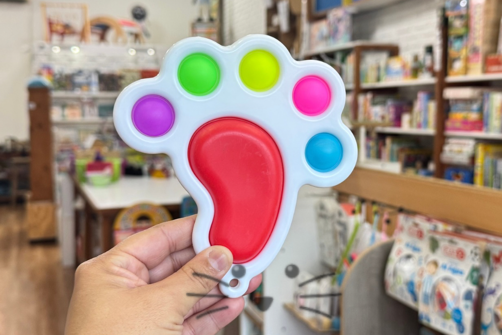 Juguete antiestres. 5 burbujas de silicona en una base plástica. Medidas: 16 cm de largo x 15 cm de alto x 2 cm de ancho