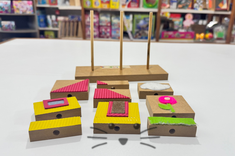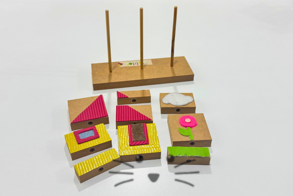 Juego de Ensartado. Base rectangular con tres palitos en los que se ensartan piezas de diversos tamaños, con texturas pegadas. Al quedar completo, se forma un paisaje de una casa y una flor.