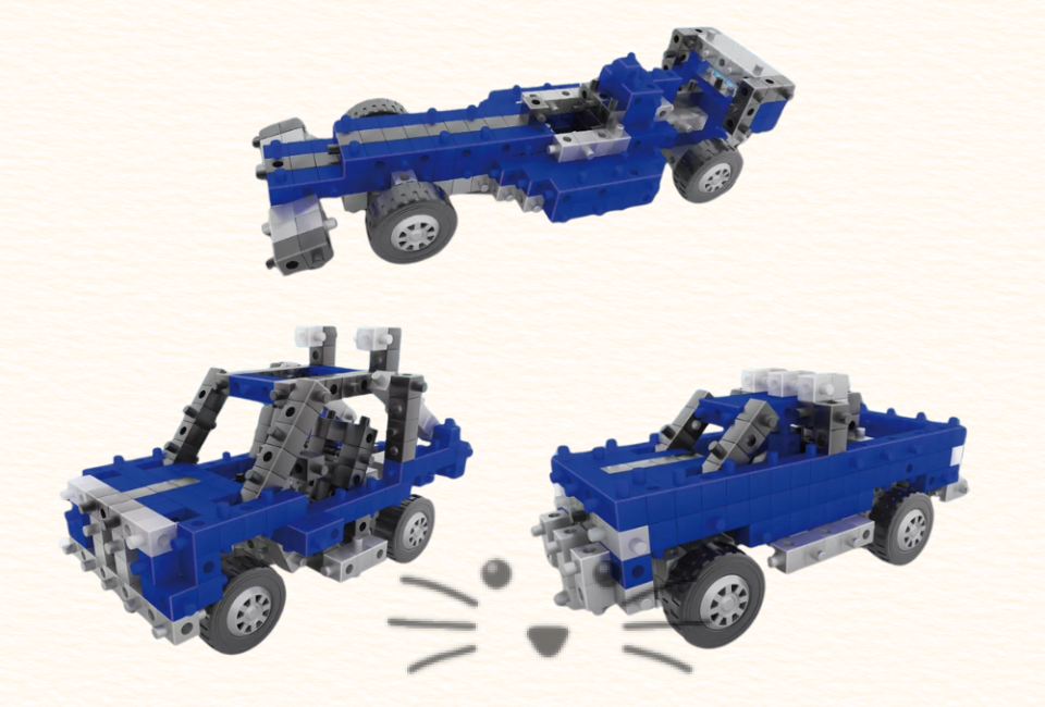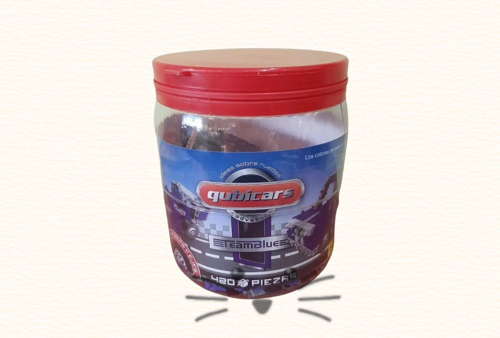Contiene 420 piezas y un folleto con instrucciones paso a paso para armar 3 autos (de a una por vez). Incluye 4 Ruedas y 2 ejes. Cubos en 4 colores: Metalizado, Natural, Negro y Azul (150 piezas de cada color). Viene en pote plástico para guardar