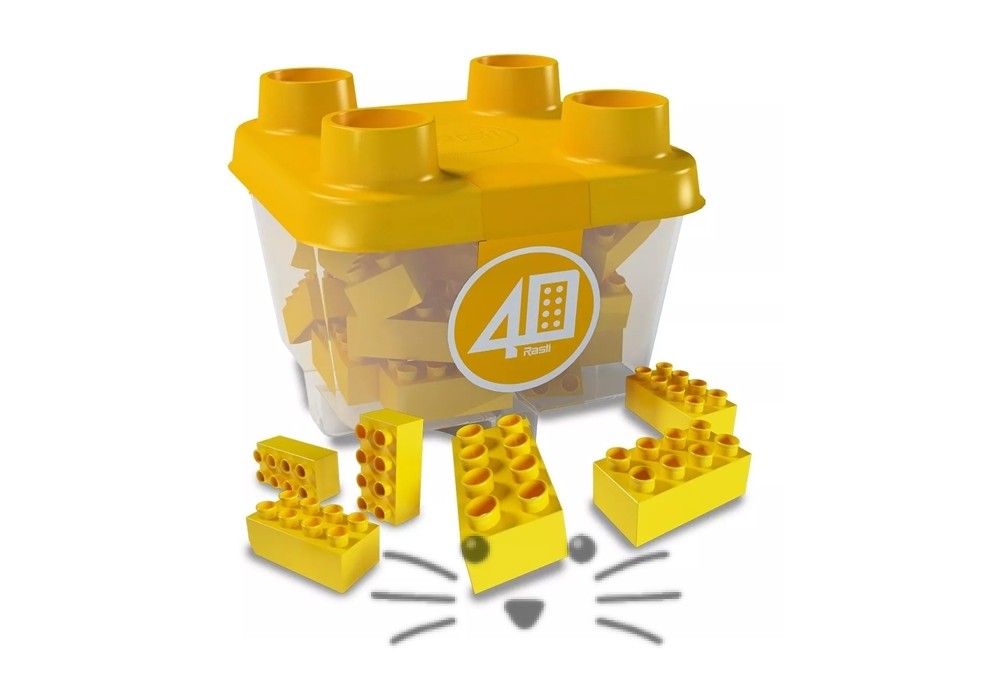 Práctico contenedor apilable con 40 bloques de construcción. Todos en color Amarillo. Edad sugerida: a partir de 3 años.