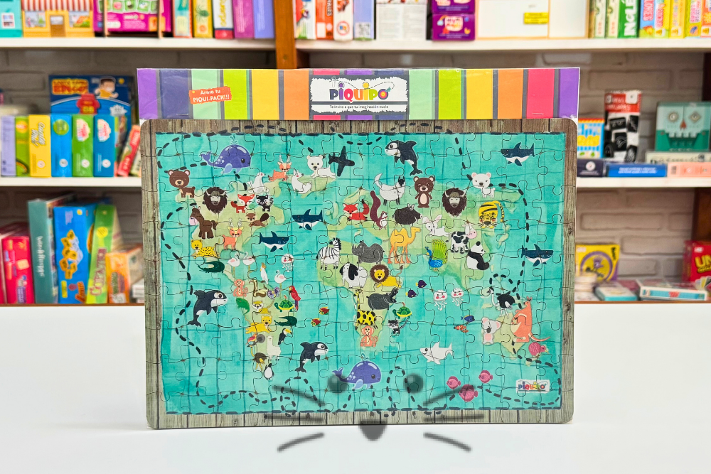 Rompecabezas de 108 piezas de madera para armar el planisferio con animales autóctonos. Medidas rompecabezas armado: 25 cm de largo x 35 cm de ancho. Edad Sugerida: de 4 a 7 años.