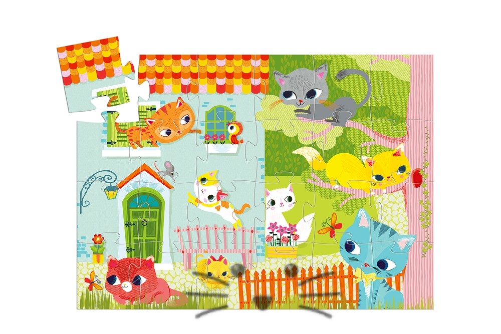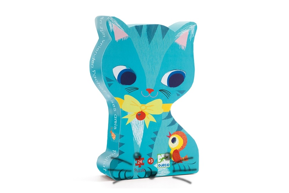 Pachat ha invitado a sus amigos a jugar en casa. Un magnífico rompecabezas de 24 piezas en una elegante caja con forma de gato. Medidas: 42 x 30 cm. Edad Sugerida: a partir de 3 años en adelante.