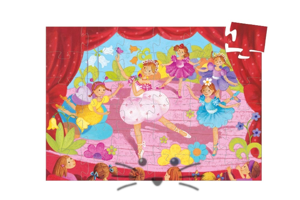 Asistamos al espectáculo de las bailarinas sobre el tema de las flores. Un hermoso rompecabezas de 36 piezas en una elegante caja con forma de bailarina. Medidas: 42 x 30 cm. Edad Sugerida: a partir de 4 años en adelante.