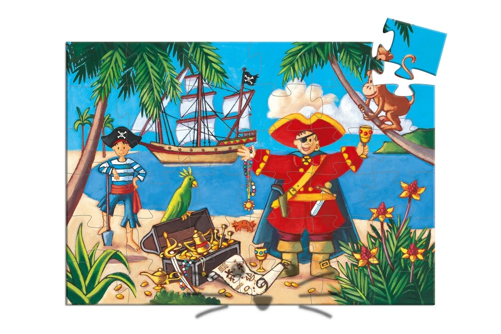 Un pirata sale en busca del tesoro con su loro. Un magnífico rompecabezas de 36 piezas en una elegante caja con forma de pirata. Medidas: 42 x 30 cm. Edad Sugerida: a partir de 4 años en adelante.