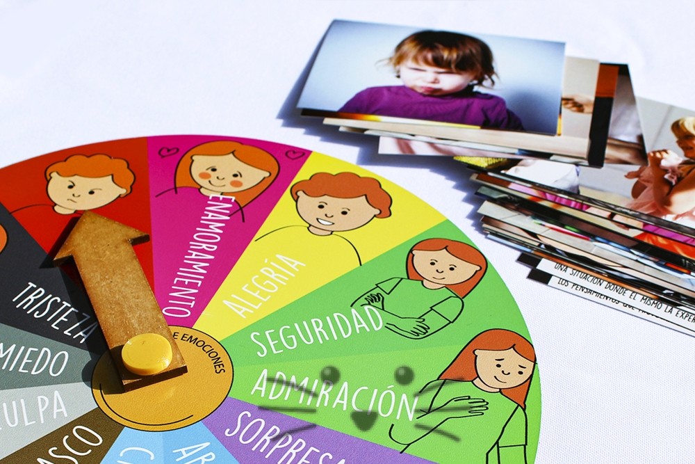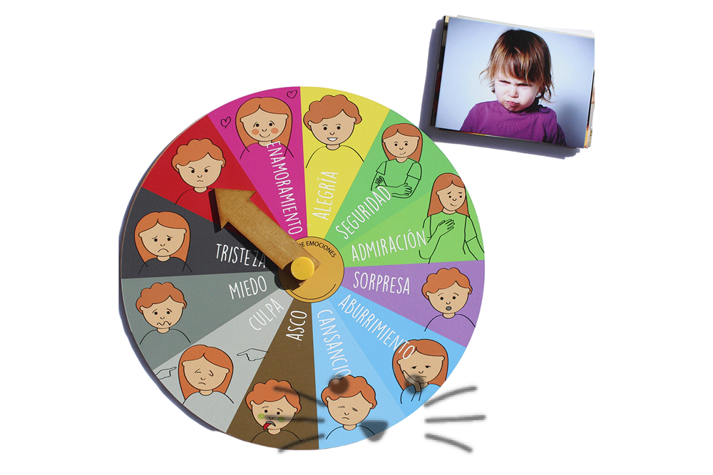 Rueda con flecha giratoria y 8 imágenes representando distintos estados de ánimo. Material pensado para la educación emocional, el reconocimiento de emociones tanto en uno mismo con en los demás. Incluye tarjetas con imágenes fotográficas de situaciones que pueden representar diferentes emociones y estados de ánimos propios o ajenos. Contiene: una placa de madera de 20 cm de diámetro y 22 tarjetas con imágenes que representan diversas emociones y una bolsa tela para guardar y transportar.