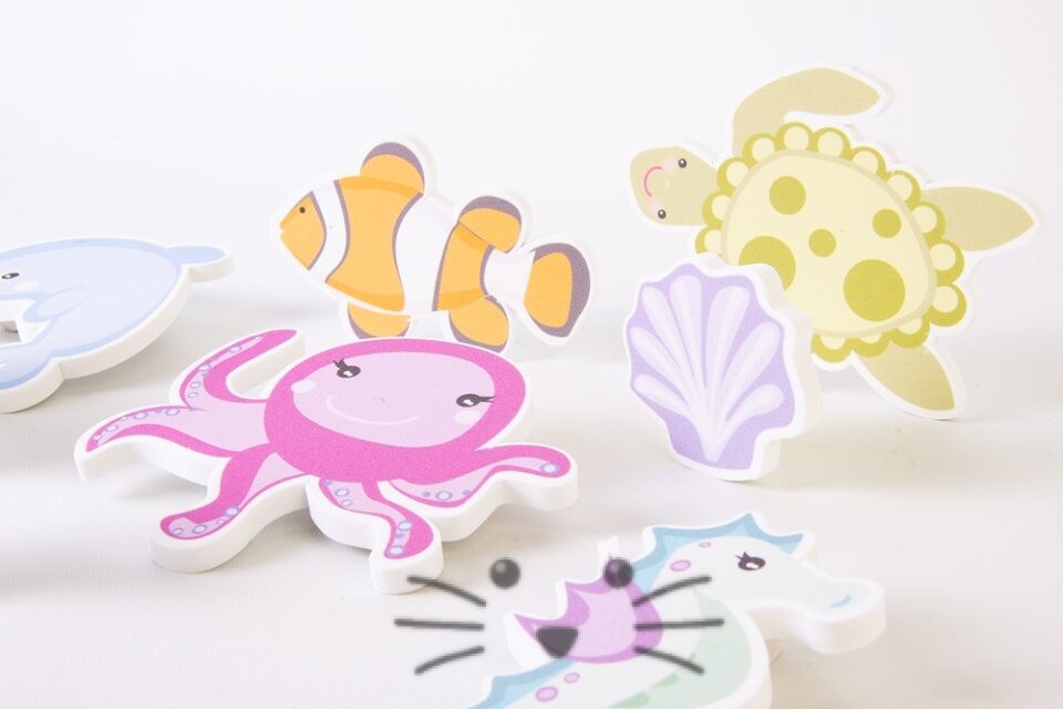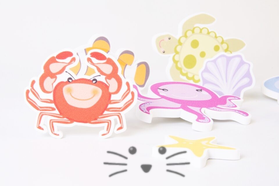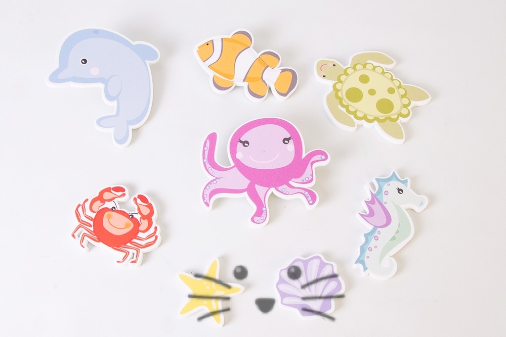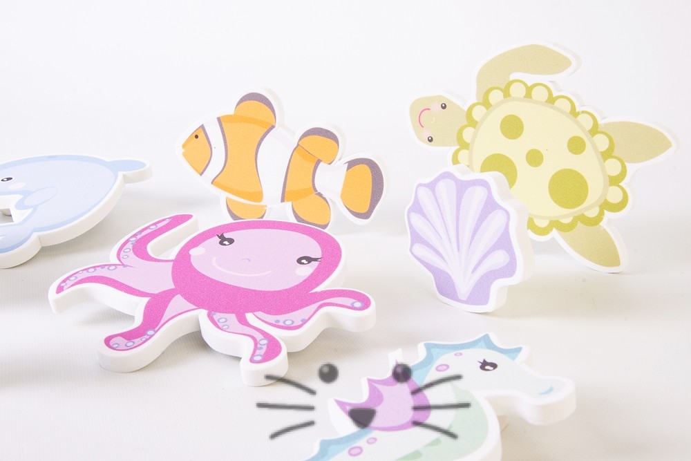 Siluetas para ordenar por tamaño y jugar recreando. Se adhieren a los azulejos y flotan en el agua.