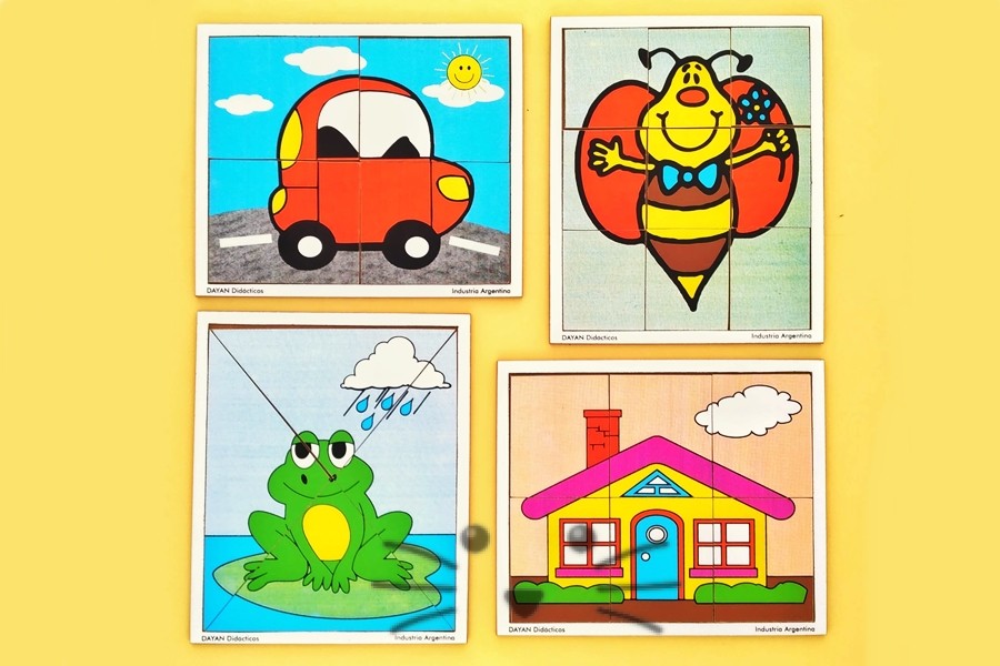 Set de 4 rompecabezas de corte lineal fabricados en fibrofácil estampado. Medidas de cada uno: 20 x 24 cm