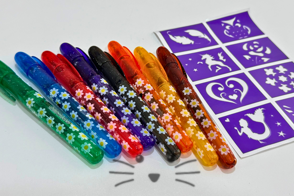 Crea tus propios tatuajes temporales con este kit que incluye 6 cintas adhesivas y 8 lapiceras. Elije el molde del sticker y posiciónalo sobre la piel, píntalo en forma circular desde afuera hacia adentro. ¡Deja secar por 1 minuto y quita el molde! El tatuaje puede ser removido con jabón, agua caliente o aceite para bebés. Material Hipoalergénico. No contiene Parabenos. Tamaño de la caja contenedora: 20 cm de alto x 3 cm de ancho x 22 cm de largo. Edad sugerida: a partir de 5 años en adelante.