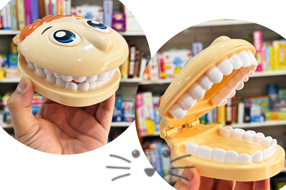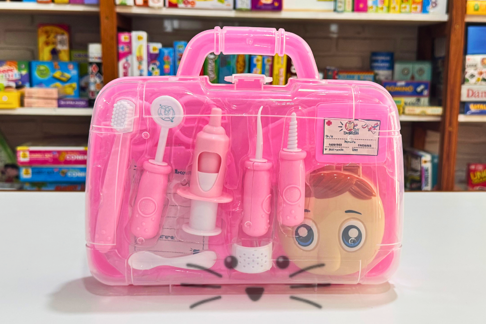 Jugá a ser un dentista de verdad con este set. La cabeza a examinar puede abrir la boca para que podas examinar sus dientes. Incluye: valija, cabeza con dentadura, cepillo de dientes, espejo bucal, jeringa, 2 instrumentos plásticos, credencial, cuchara, cuña pulsera, anteojos, porta notas con lápiz plástico, hoja y pinza. Medidas de la valija: 29 cm de ancho x 22 cm de alto. Edad Sugerida: a partir de 4 años en adelante.