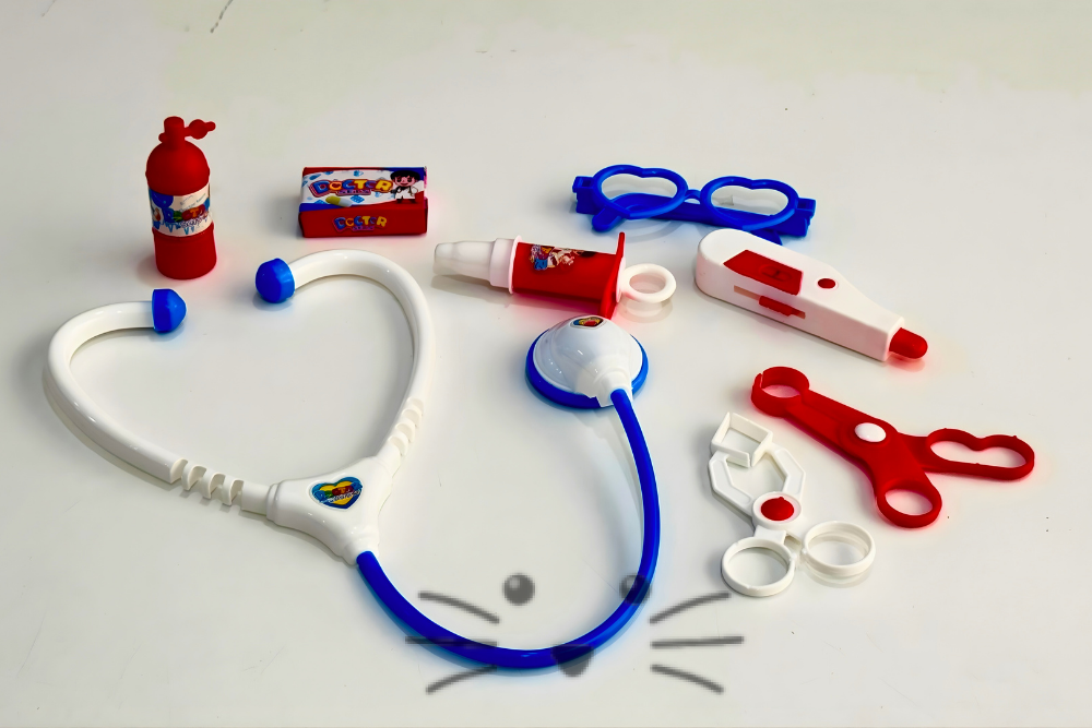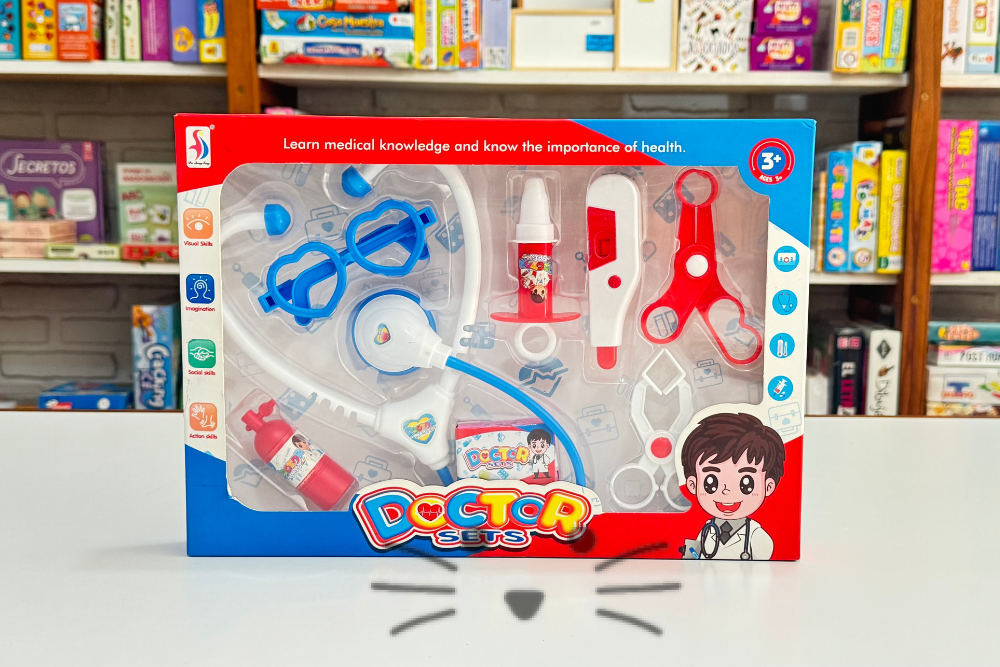 Juego de rol ideal para que niños y niñas exploren el mundo de la medicina. Incluye cuchara, estetoscopio, palillos, termómetro, tijera, pinza y accesorios que invitan a imaginar, crear historias y asumir distintos roles.
