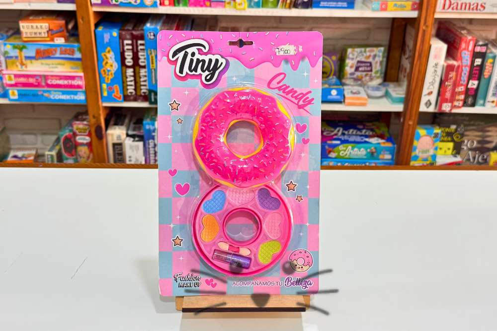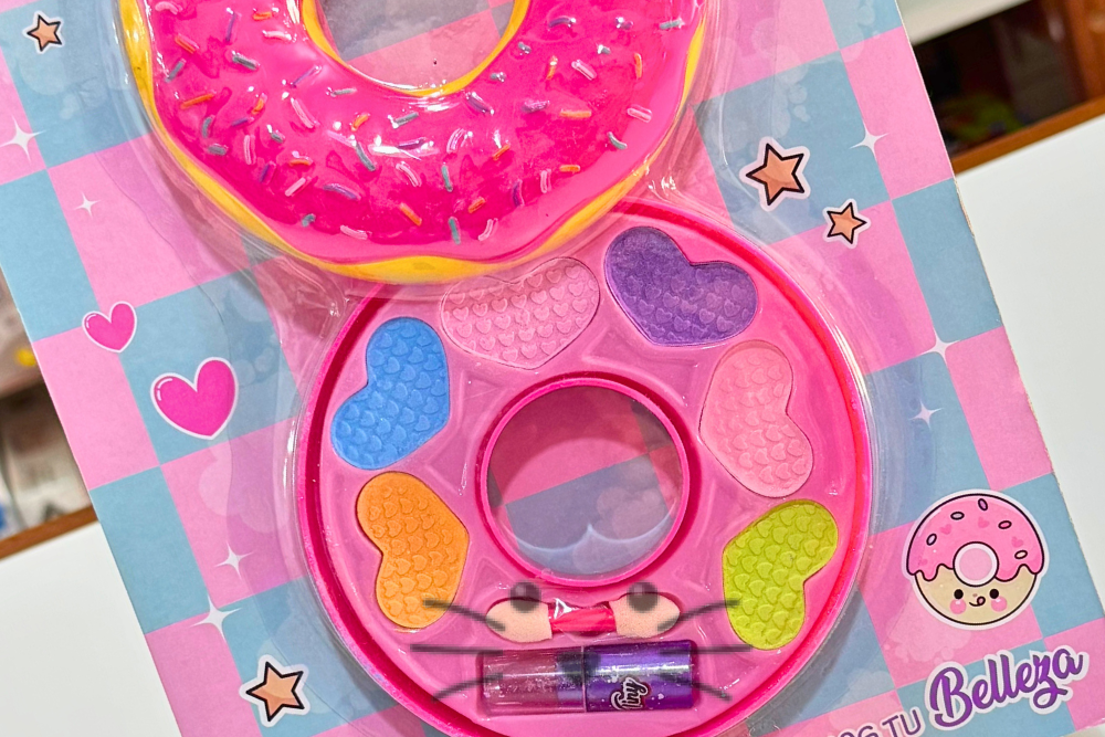 Set de maquillaje desplegable con forma de dona en color rosa. Contiene: 6 Sombras de ojos de diferentes colores, 1 labial, y 1 accesorio aplicador. Edad Sugerida: a partir de 5 años.