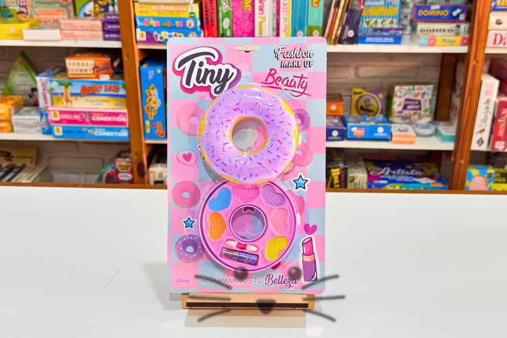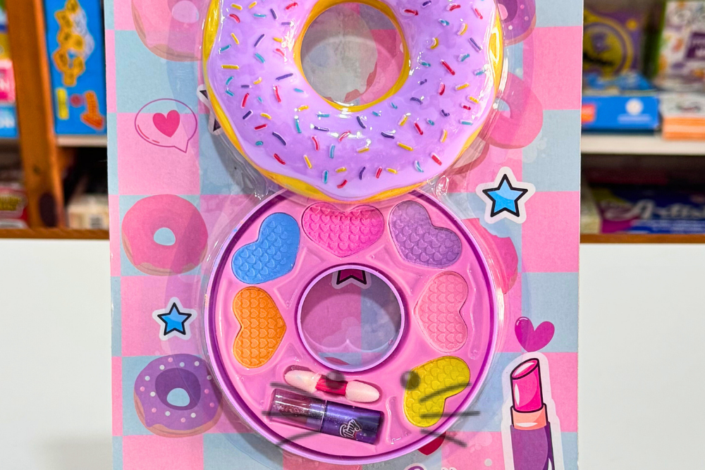 Set de maquillaje desplegable con forma de dona en color lila. Contiene: 6 Sombras de ojos de diferentes colores, 1 labial, y 1 accesorio aplicador. Edad Sugerida: a partir de 5 años.