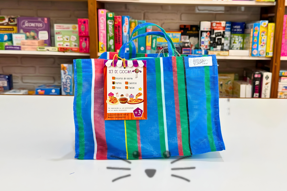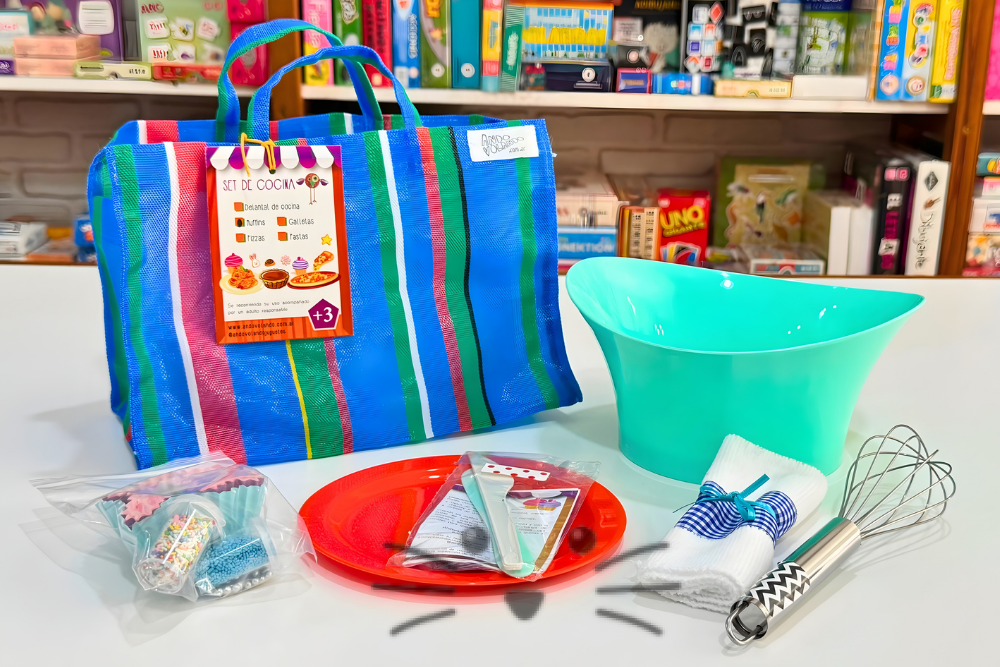 Incluye: Bolsita de mercado, receta, plato, bowl y cuchillo plástico, 6 pirotines, espátula de acrílico, repasador, batidor, frasquitos y bolsita con confites comestibles para decorar.