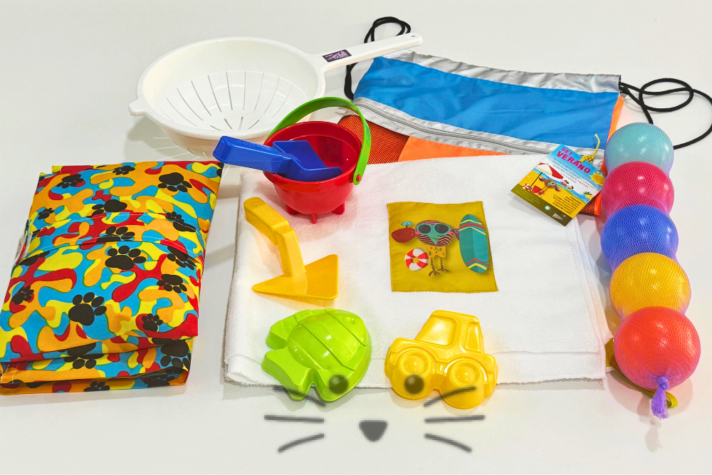 Incluye: mochila de tela impermeable, lona de playa con almohada, toallón de microfibra de secado rápido, baldecito, juego de palitas, 2 moldes para arena, figuras de goma eva, 5 pelotas de pelotero y un atrapacosas.