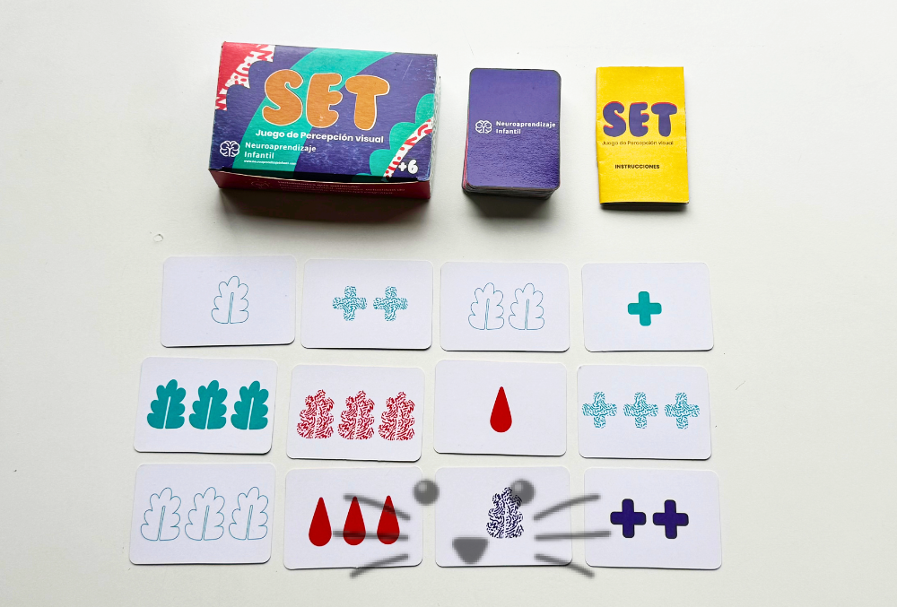 Juego de cartas que propone la estimulación de la percepción visual, velocidad de procesamiento, atención, flexibilidad cognitiva y razonamiento. El objetivo del juego es identificar un grupo SET de tres cartas entre 12 colocadas sobre la mesa. Cada carta es única y cuenta con su respectiva variación de símbolo, color, número y tono. Un SET consiste en 3 cartas en las que cada característica es igual o es diferente. Es decir, cualquier característica en el SET es igual o diferente en las 3 cartas. Edad Sugerida: a partir de 6 años