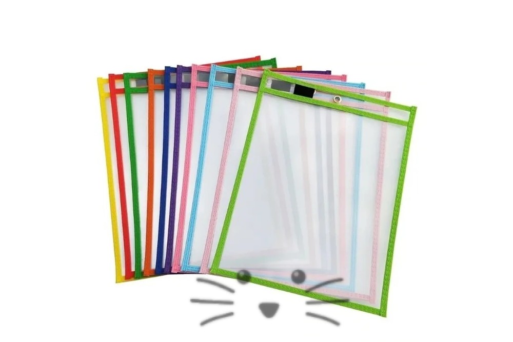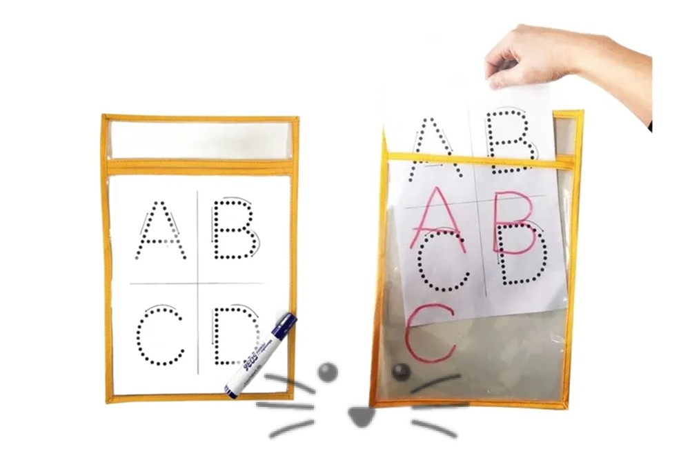 Sobre transparente en tamaño A4 pensado para favorecer la práctica de la escritura. Las hojas de práctica se pueden intercambiar, podes colocar hojas blancas para dibujar, juegos, etc…Se puede escribir y borrar una y otra vez. Se limpia fácilmente con un paño o pañuelitos húmedos. No más necesidad de imprimir y desperdiciar papel. Los colores pueden variar según disponibilidad.