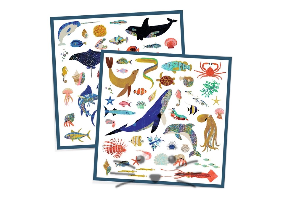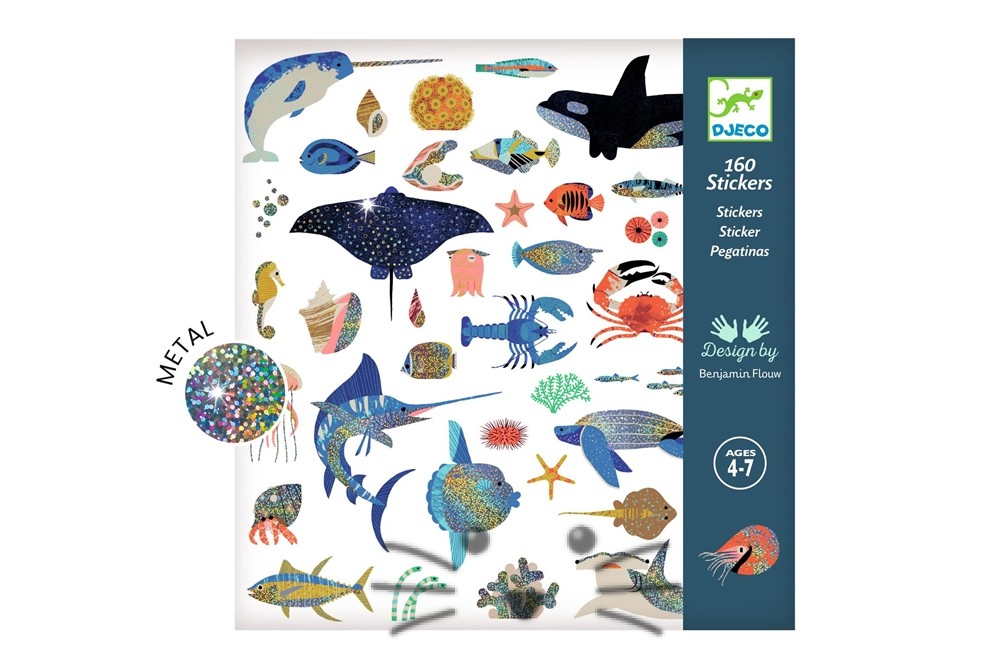 Un kit de 160 pegatinas metalizadas sobre el océano. Peces espada, cangrejos ermitaños, peces luna, caballitos de mar… ¡Una infinidad de animales variados y brillantes de la fauna submarina por descubrir! Solo tienes que pegar las pegatinas a tu gusto para crear tus propias historias o decorar lo que quieras. Edad Sugerida: de 4 años a 7 años.