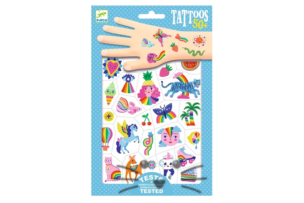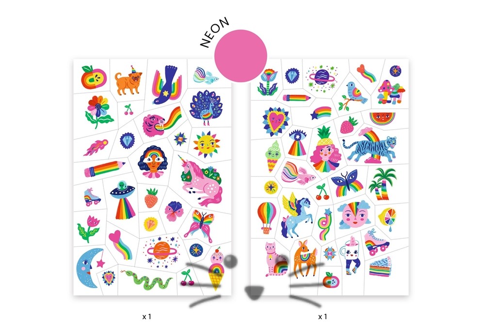 Dos hojas de calcomanías con los colores del arcoíris y estilo pop acentuado con detalles en rosa fluorescente. Son fáciles de usar, están precortados y se aplican con un poco de agua. Probados dermatológicamente. Contenido: 2 planchas de tatuajes temporales y 1 manual de instrucciones. Edad Sugerida: a partir de 3 años en adelante.