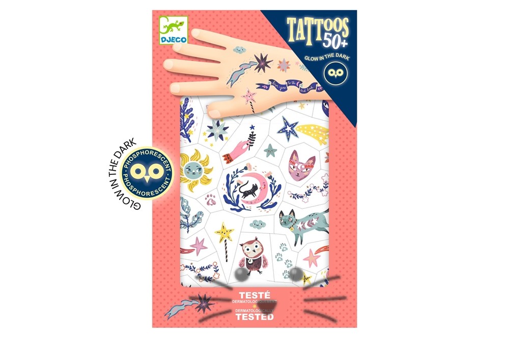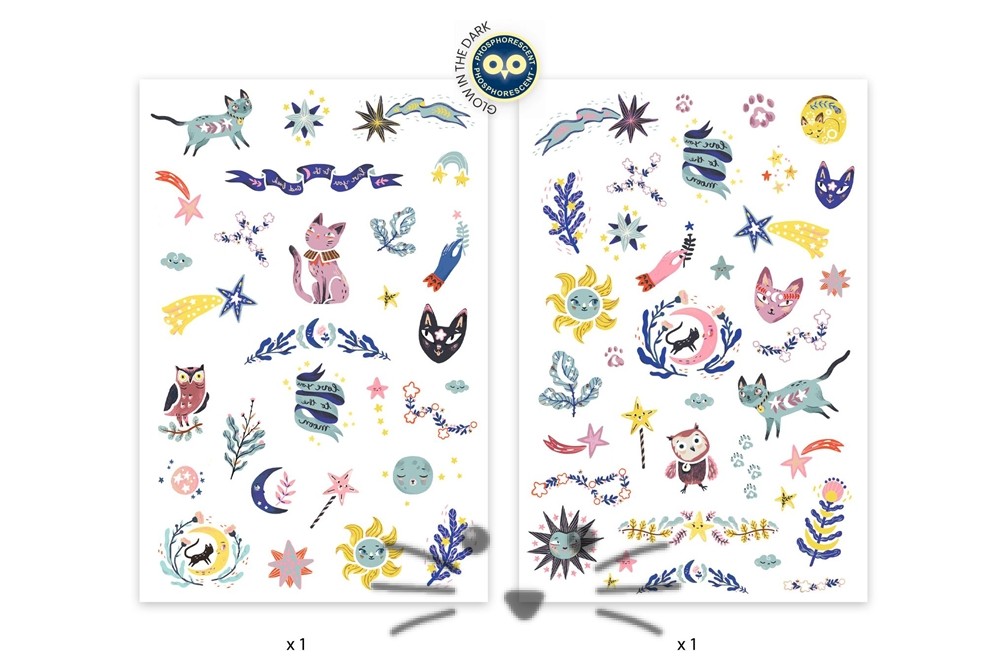 Dos hojas de calcomanías sobre el tema de la noche, con animales adorables. Las sorpresas y los pequeños detalles fosforescentes brillan en la oscuridad. Estas calcomanías fáciles de usar están precortados y se aplican con un poco de agua. Dermatológicamente probado. Contenido: 2 hojas de calcomanías fosforescentes y 1 manual de instrucciones. Contenido: 2 hojas de calcomanías fosforescentes y 1 manual de instrucciones. Edad Sugerida: a partir de 3 años en adelante.