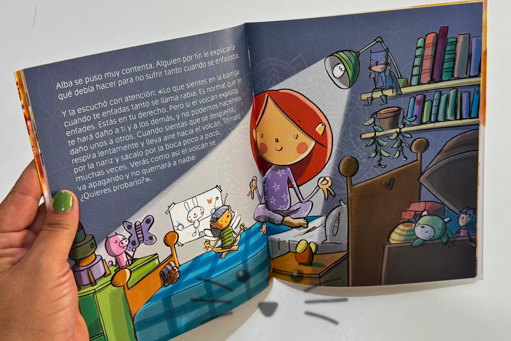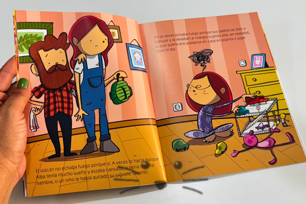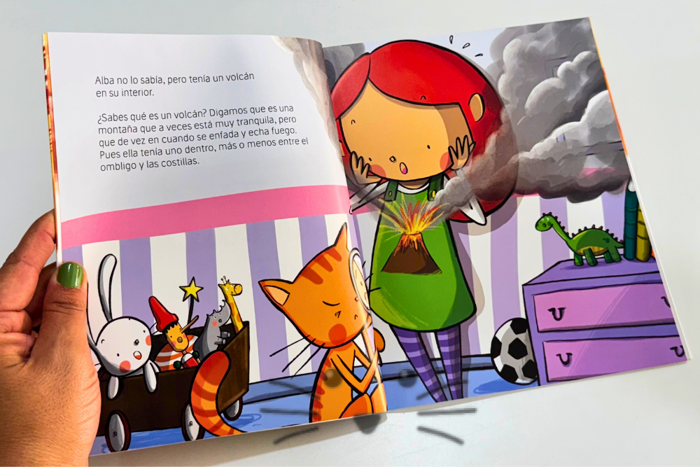 Alba no lo sabía, pero tiene un volcán en su interior, más o menos entre el ombligo y las costillas. A veces, el volcán se enciende y explota. Entonces el fuego lo quema todo y Alba sufre y se asusta, todo a la vez. Pero una noche una pequeña hada le explica qué puede hacer cuando se enfada, un truco que la llevará a descubrir sensaciones inesperadas. Autores: Joan Turu, Míriam Tirado. Abrazandocuentos Ediciones