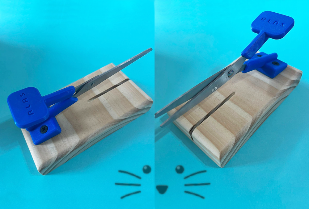 Diseñada para dar soporte en la actividad de recorte, brindando un apoyo seguro y generando practicidad en los movimientos. La base va permitir que se pueda usar con una sola mano o palma de la misma. La tijera posee filo. Material rígido impreso en 3D. La base es de madera de pino. Los colores varían según stock disponible.