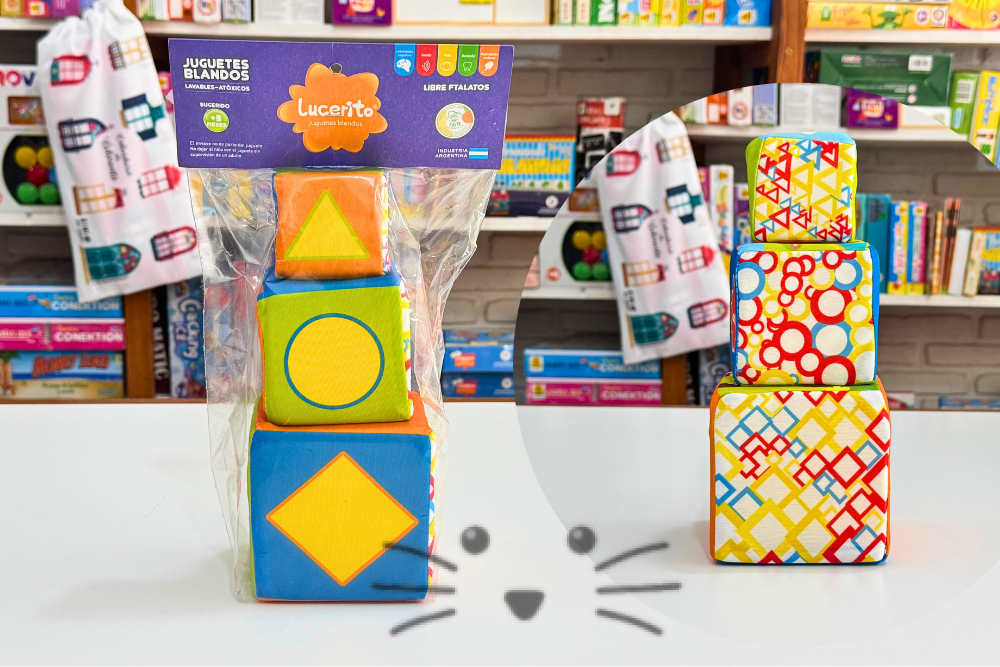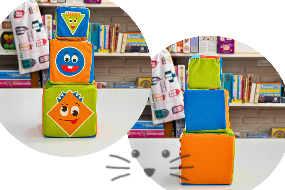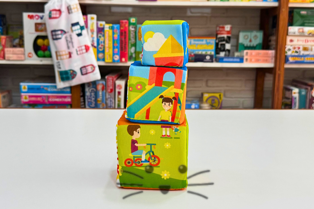 Incluye tres bloques de distintos tamaños (10×10 cm, 8×8 cm y 6×6 cm), livianos y seguros, que pueden apilarse, desarmarse y girarse, cada uno con ilustraciones coloridas, personajes amigables y dibujos geométricos. Fabricados en jersey de seda estampada