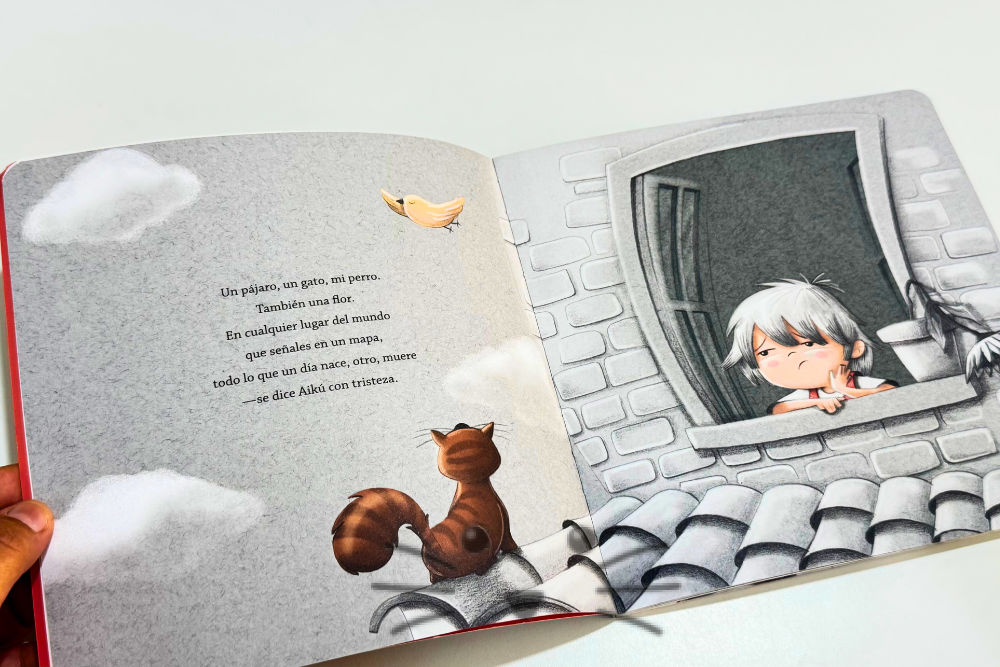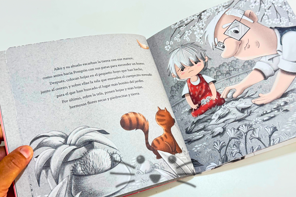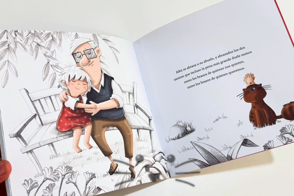 Un pájaro, un gato, un perro. También una flor. Todo aquello que amamos se va al lugar que le hacemos en nuestro corazón. Ahí es a donde se ha ido Pompón, el perro de Aikú, y ahí es a donde le gustaría ir al abuelo de la niña el día en que también él se desprenda como una hoja. Autor: Camino García. Ilustración: Quiel Ramos