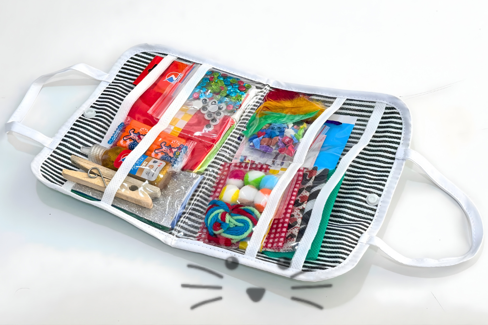 Contenido: Cartulinas y afiches. Telas. Plumas de colores. Goma eva picada. Lanas de colores. Pompones de colores. Ojitos móviles. Lentejuelas. Broche de madera. Plastilina. Adhesivo glitter. Lápices de colores. Papel crepe. Rectángulos de goma eva. Ideas de arte para hacer