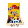 Valija de madera que contiene muchas formitas imantadas de colores para crear barrios sobre la tapa metálica. Incluye casitas, personajes y objetos urbanos. Materiales: Caja de madera de 21 x 25 cm, tapa de chapa esmaltada con pintura epoxi, figuras de goma eva de 3 mm imantada. Edad sugerida: a partir de 3 años.