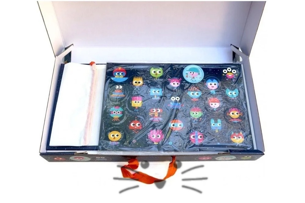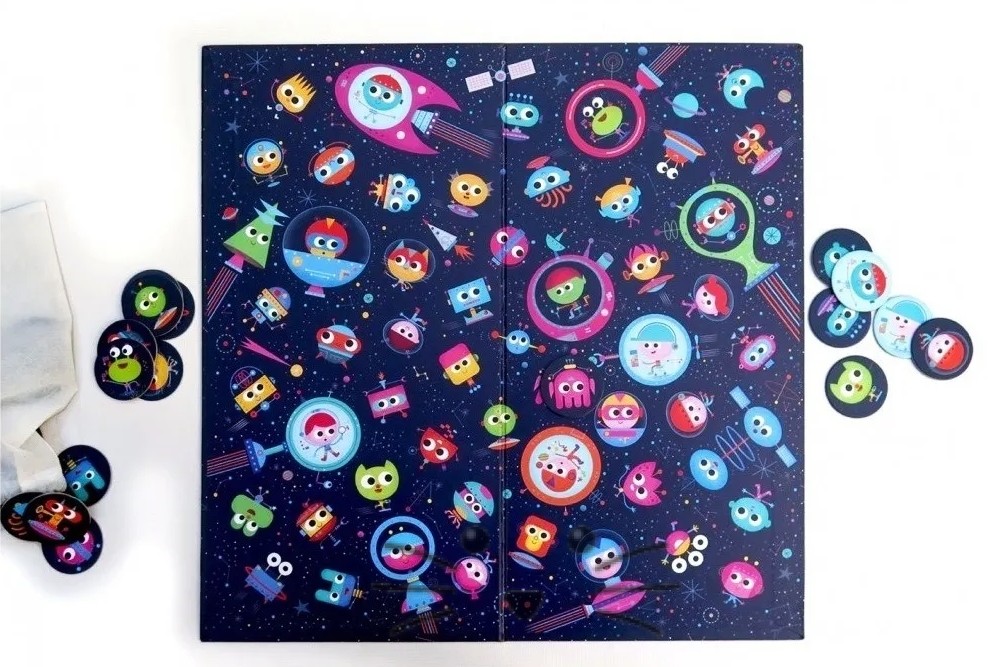 Un juego de observación y rapidez visual. 50 pajaritos para buscarlos y encontrarlos en el tablero. Se reparten igual cantidad de fichas para cada jugador, comienza el juego y se busca en el tablero la misma imagen que en la ficha, el que se queda sin fichas primero, gana. Edad sugerida: a partir de 3 años en adelante.